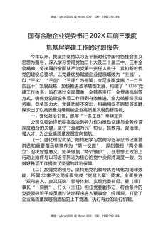国有金融企业党委书记202X年前三季度抓基层党建工作的述职报告.doc