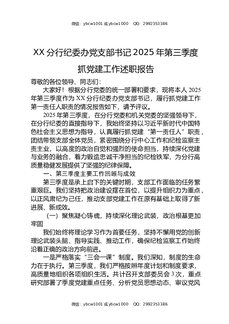 XX分行纪委办党支部书记2025年第三季度抓党建工作述职报告.docx