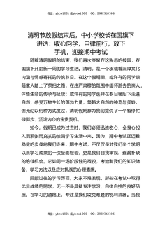 清明节放假结束后,中小学校长在国旗下讲话:收心向学,自律前行,放下手机,迎接期中考试.docx