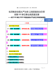 2025.11.4(写作模板)(关于XX单位2025年度全面从严治党工作情况的报告)纵深推进全面从严治党 以高质量政治引领保障XX单位事业高质量发展