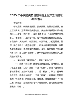 2025年中秋国庆节日期间安全生产工作提示讲话材料