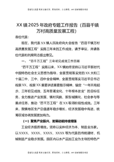 XX镇2025年政府专题工作报告(百县千镇万村高质量发展工程).docx