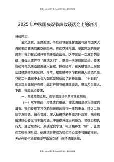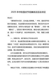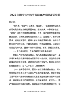 2025年国庆节中秋节节前廉政提醒谈话提纲