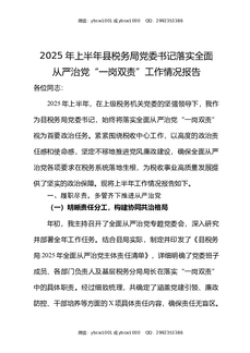 2025年上半年县税务局党委书记落实全面从严治党一岗双责工作情况报告.docx