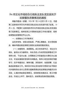 XX市文化市场综合行政执法支队党支部关于巡察整改进展情况的通报.docx