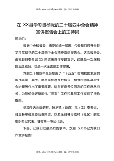 在XX县学习贯彻党的二十届四中全会精神宣讲报告会上的主持词.docx