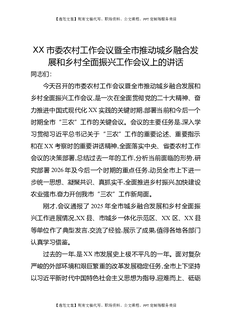 XX市委农村工作会议暨全市推动城乡融合发展和乡村全面振兴工作会议上的讲话.docx