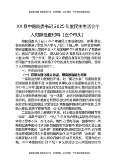 XX县中医院党委书记2025年度民主生活会个人对照检查材料(五个带头).docx
