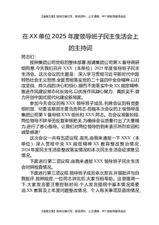 在XX单位2025年度领导班子民主生活会上的主持词.docx