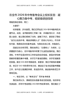 在全市2026年中考备考会议上校长发言:凝心聚力备中考,砥砺奋进创佳绩.doc