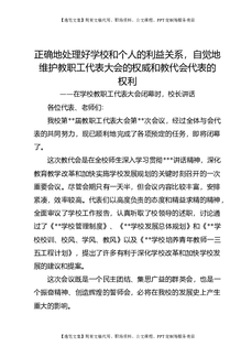 在学校教职工代表大会闭幕时,校长讲话:正确地处理好学校和个人的利益关系,自觉地维护教职工代表大会的权威和教代会代表的权利.doc