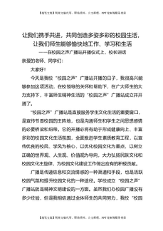 在校园之声广播站开播仪式上,校长讲话:让我们携手共进,共同创造多姿多彩的校园生活,让我们师生能够愉快地工作、学习和生活.doc