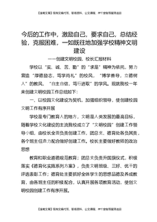 创建文明校园,校长汇报材料:今后的工作中,激励自己,要求自己,总结经验,克服困难,一如既往地加强学校精神文明建设.docx
