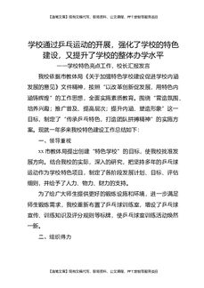 学校特色亮点工作,校长汇报发言:学校通过乒乓运动的开展,强化了学校的特色建设,又提升了学校的整体办学水平.docx