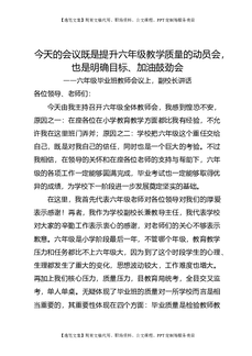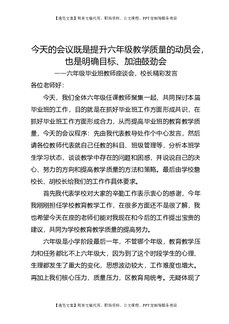 六年级毕业班教师会议上,副校长讲话:今天的会议既是提升六年级教学质量的动员会,也是明确目标、加油鼓劲会.doc