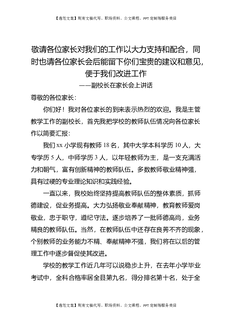 副校长在家长会上讲话:敬请各位家长对我们的工作以大力支持和配合,同时也请各位家长会后能留下你们宝贵的建议和意见,便于我们改进工作.doc