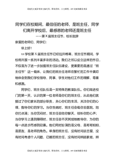 第X届班主任节,校长致辞:同学们在校期间,最信任的老师,是班主任,同学们离开学校后,最感恩的老师还是班主任.doc
