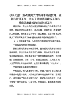 校长汇报:重点落实了对领导干部的教育、监督和管理工作,落实了师德师风建设工作和反腐倡廉建设的机制创新工作.doc