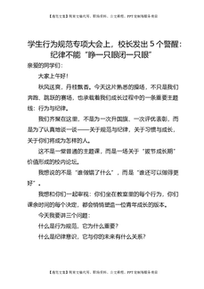 学生行为规范专项大会上,校长发出5个警醒:纪律不能“睁一只眼闭一只眼”.doc