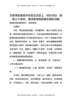在教育质量提升经验交流会上,校长讲话:破解三个密码,激活教育高质量发展新动能.doc