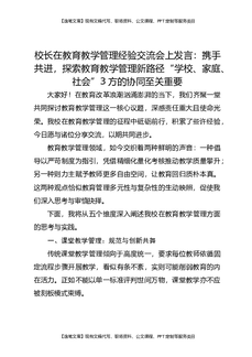 校长在教育教学管理经验交流会上发言:携手共进,探索教育教学管理新路径“学校、家庭、社会”3方的协同至关重要.docx
