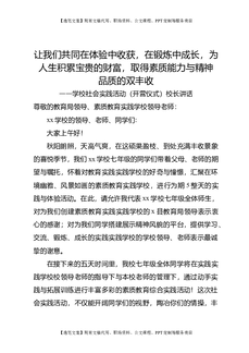 学校社会实践活动(开营仪式)校长讲话:让我们共同在体验中收获,在锻炼中成长,为人生积累宝贵的财富,取得素质能力与精神品质的双丰收.docx