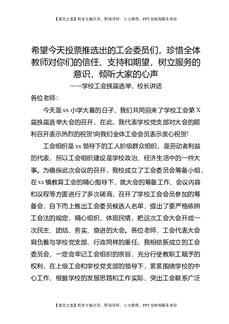 学校工会换届选举,校长讲话:希望今天投票推选出的工会委员们,珍惜全体教师对你们的信任、支持和期望,树立服务的意识,倾听大家的心声.docx