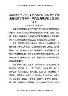 家长会上校长讲话:家长对学校工作的支持和配合,积极参与到学生的教育管理中来,从而促进孩子身心健康地成长.docx