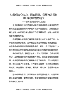 校长在家委会会议上讲话:让我们齐心协力、同心同德、荣辱与共同创XX学校辉煌的明天.docx