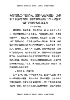 校长事迹:分管后勤工作副校长,坚持为教学服务、为教职工服务的方向,团结带领后勤工作人员努力做好后勤服务保障工作.docx