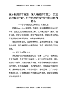 学校特色亮点工作总结,校长汇报:充分利用校本资源,深入挖掘校本潜力,灵活运用教育手段,科学合理地把学校特长转化为特色.docx