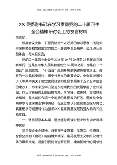 副县长XX在学习贯彻党的二十届四中全会精神研讨会上的发言材料.docx