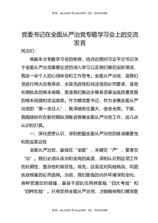 党委书记在全面从严治党专题学习会上的交流发言.docx
