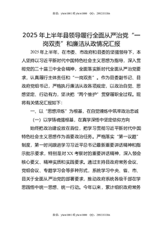 2025年县领导履行全面从严治党“一岗双责”和廉洁从政情况总结汇报.docx