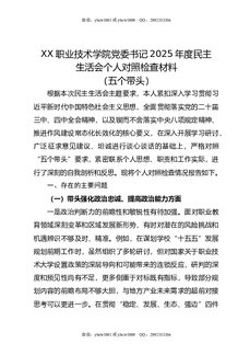 XX职业技术学院党委书记2025年度民主生活会个人对照检查材料(五个带头).doc