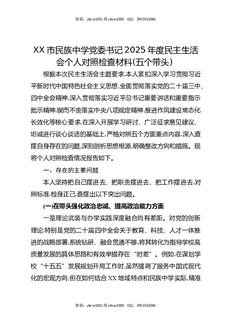 XX市民族中学党委书记2025年度民主生活会个人对照检查材料(五个带头).docx