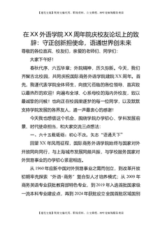 在XX外语学院XX周年院庆校友论坛上的致辞:守正创新担使命,语通世界创未来.doc