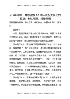 在XX市第三中学建校XX周年庆祝大会上的致辞:七秩溯源,精雅行远.doc
