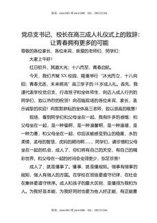 党总支书记,校长在高三成人礼仪式上的致辞:让青春拥有更多的可能.docx