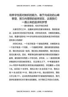 家长联谊会,校长开场白讲话:培养学生面对挫折的能力,敢于向成功的山峰攀登,努力向理想的彼岸进发,这是我们一直以来的追求和梦想.docx