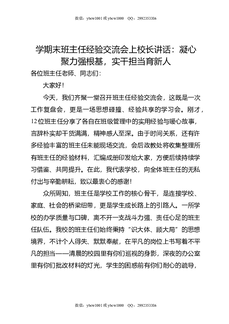 学期末班主任经验交流会上校长讲话:凝心聚力强根基,实干担当育新人.doc