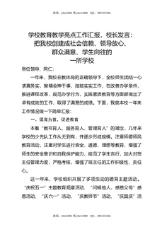 学校教育教学亮点工作汇报,校长发言:把我校创建成社会信赖,领导放心,群众满意,学生向往的一所学校.doc