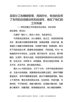 学校后勤工作经验交流分享会,校长讲话:层分工和精细管理,用其所长,有效的发挥了老师的自觉能动性和创造性,焕发了他们的工作热情.docx