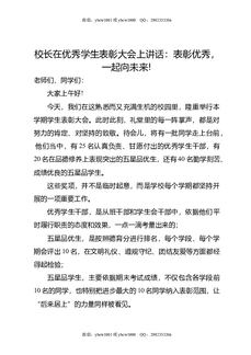 校长在优秀学生表彰大会上讲话:表彰优秀,一起向未来!.doc