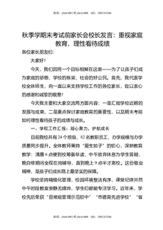 秋季学期末考试前家长会校长发言:重视家庭教育,理性看待成绩.doc