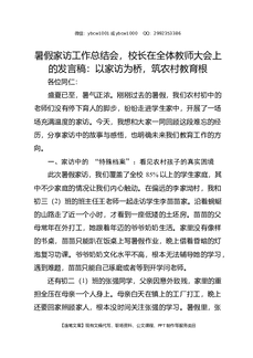 暑假家访工作总结会,校长在全体教师大会上的发言稿:以家访为桥,筑农村教育根