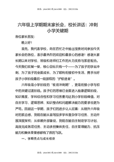 六年级上学期期末家长会,校长讲话:冲刺小学关键期.doc