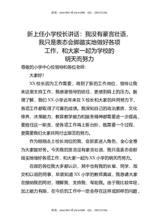 新上任小学校长讲话:我没有豪言壮语,我只是表态会脚踏实地做好各项工作,和大家一起为学校的明天而努力.doc