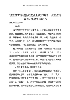 班主任工作经验交流会上校长讲话:小主任担大责,细耕耘育新苗.doc