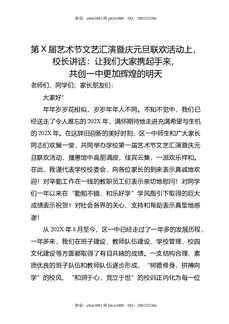 第X届艺术节文艺汇演暨庆元旦联欢活动上,校长讲话:让我们大家携起手来,共创一中更加辉煌的明天.doc